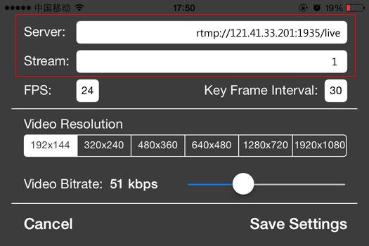 上图红色框图的位置输入在网播视频平台中"开通直播"获得的推流发布地址(例如推流地址:rtmp://121.41.33.201:1935/live/1,则地址前面部分"rtmp://121.41.33.201:1935/live"输入到上图中的"Server"文本框,最后一个分隔符"/"后面的字符串"1"输入到"Stream"文本框),